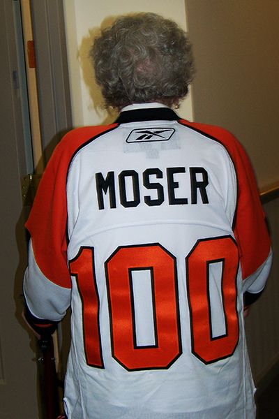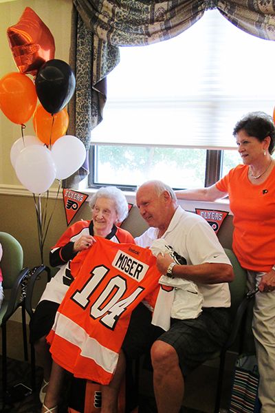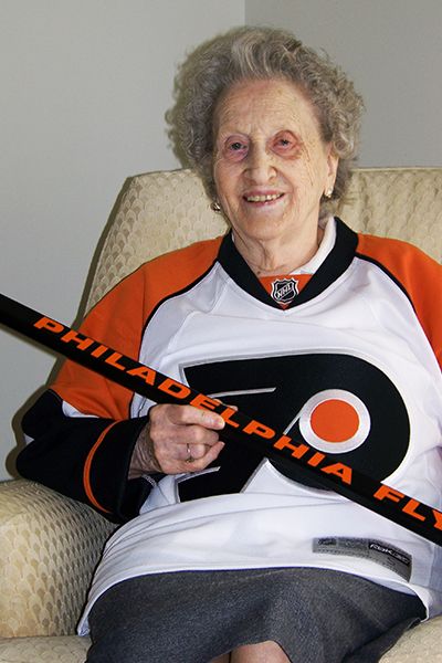 In her childhood, Helen was a big soccer fan. Her love of soccer morphed into a love for the sport of Hockey. She followed the Philadelphia Flyers for decades! On her 100th birthday, the Flyers gave her a professional hockey stick, signed by all the players. If that wasn’t enough, on her 104th birthday, her wish to meet an actual player came true when Hall of Famer, Bob the Hound Kelly came to her Wesley birthday party and presented her with her very own Flyers Jersey. He let her try on his championship ring, and she nearly fainted!